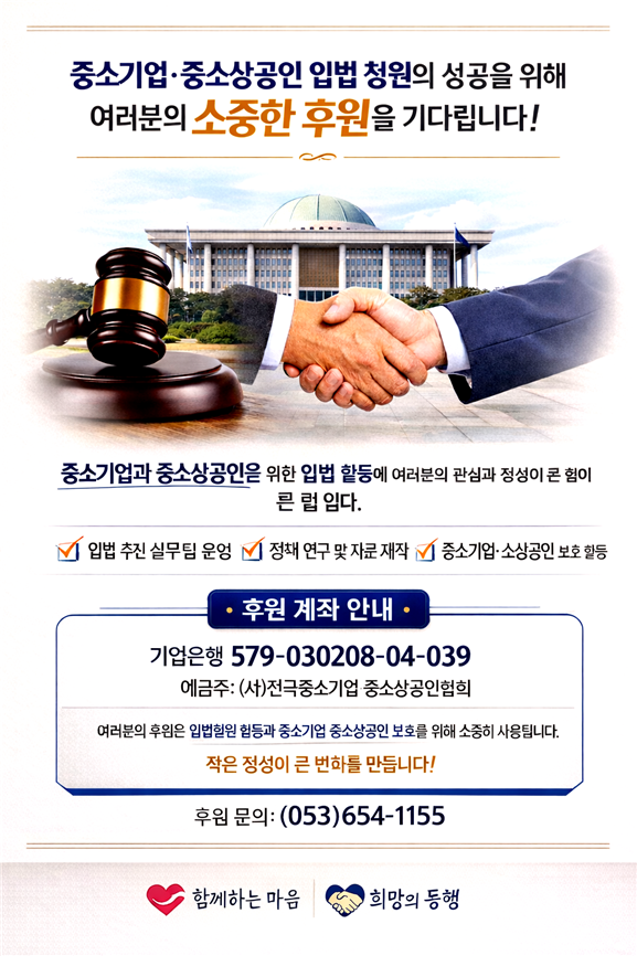 Áß¼Ò±â¾÷ÀÌ »ì¾Æ¾ß ´ëÇѹα¹ °æÁ¦°¡ »ê´Ù´Â ½Å³ä ¾Æ·¡, À̹ø ÀÔ¹ý ¿îµ¿ÀÌ ½ÇÁúÀûÀÎ º¯È­·Î À̾îÁú ¼ö ÀÖµµ·Ï »çȸ °¢°èÀÇ Âü¿©°¡ ¿ä±¸µÇ°í ÀÖ´Ù.