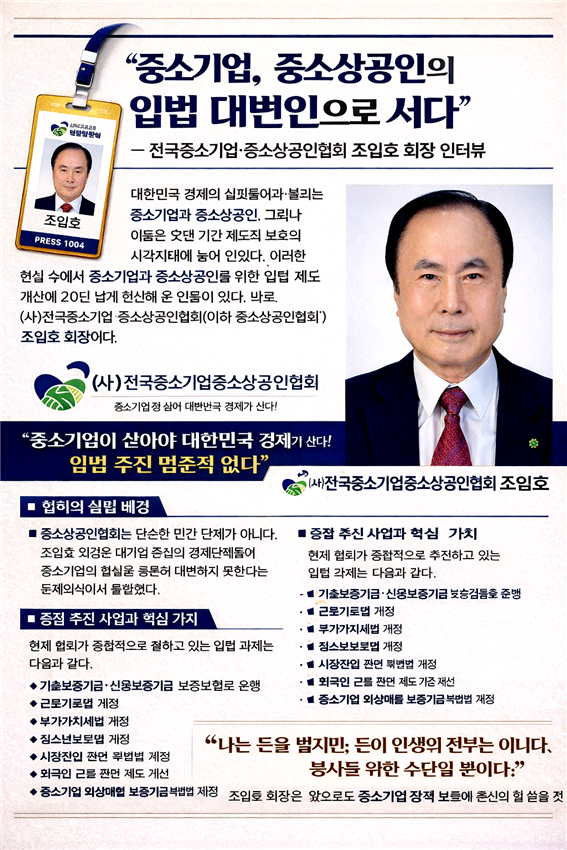´ëÇѹα¹ °æÁ¦ÀÇ ½ÇÇÍÁÙÀ̶ó ºÒ¸®´Â Áß¼Ò±â¾÷°ú Áß¼Ò»ó°øÀÎ. ±×·¯³ª À̵éÀº ¿À·£ ±â°£ Á¦µµÀû º¸È£ÀÇ »ç°¢Áö´ë¿¡ ³õ¿© ÀÖ¾ú´Ù. ÀÌ·¯ÇÑ Çö½Ç ¼Ó¿¡¼­ Áß¼Ò±â¾÷°ú Áß¼Ò»ó°øÀÎÀ» À§ÇÑ ÀÔ¹ý°ú Á¦µµ °³¼±¿¡ 20³â ³Ñ°Ô Çå½ÅÇØ ¿Â Àι°ÀÌ ÀÖ´Ù. ¹Ù·Î (»ç)Àü±¹Áß¼Ò±â¾÷·Áß¼Ò»ó°øÀÎÇùȸ(ÀÌÇÏ ‘Áß¼Ò»ó°øÀÎÇùȸ’) Á¶ÀÓÈ£ ȸÀåÀÌ´Ù.